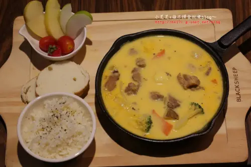 撒上滿滿的乳酪絲,配料則有紅蘿蔔,馬鈴薯,年糕及雞腿肉