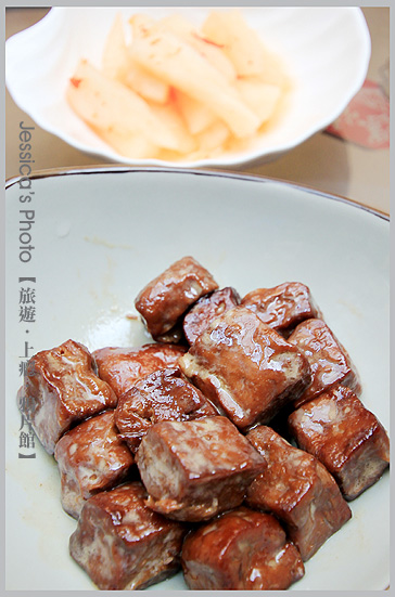 下圖左是豆乾,冷藏後上桌,也不用加熱就可以吃,滷味帶著一股清淡的中藥香氣,後面那盤是醃蘿蔔,大家都稱讚好吃。