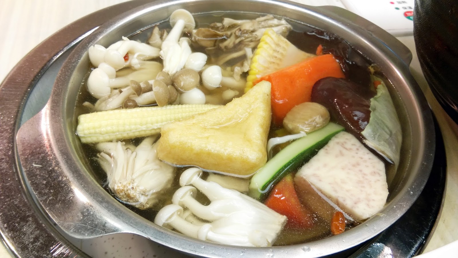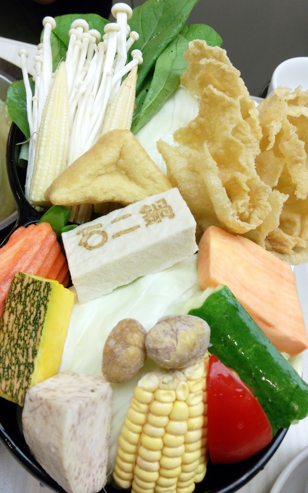 素 菜盤,有著玉米、豆腐、蕃茄、南瓜、紅蘿蔔、豆皮、玉米荀、金針菇、高麗菜、、等