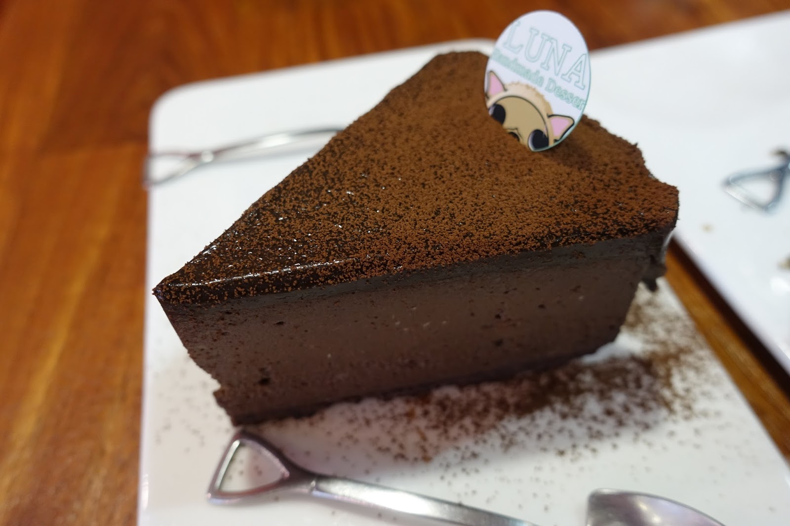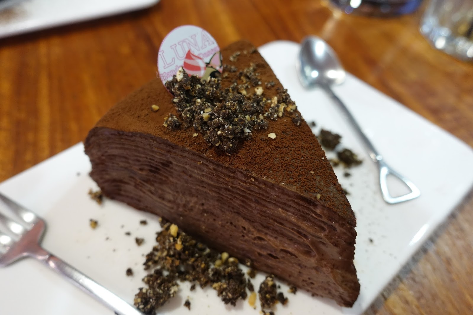 巧克力千層蛋糕從櫃子取出後又撒上巧克力碎片才送上桌,我喜歡這份蛋糕但卻不喜歡上面的巧克力碎片,我覺得撒了反而是減分,柔嫩的千層蛋糕與飽滿的巧克力奶醬,吃起來很滑順,由於尺寸不小下次應該會考慮兩人合吃一份蛋糕,另外也有抹茶口味的千層蛋糕,留待下次來試試。