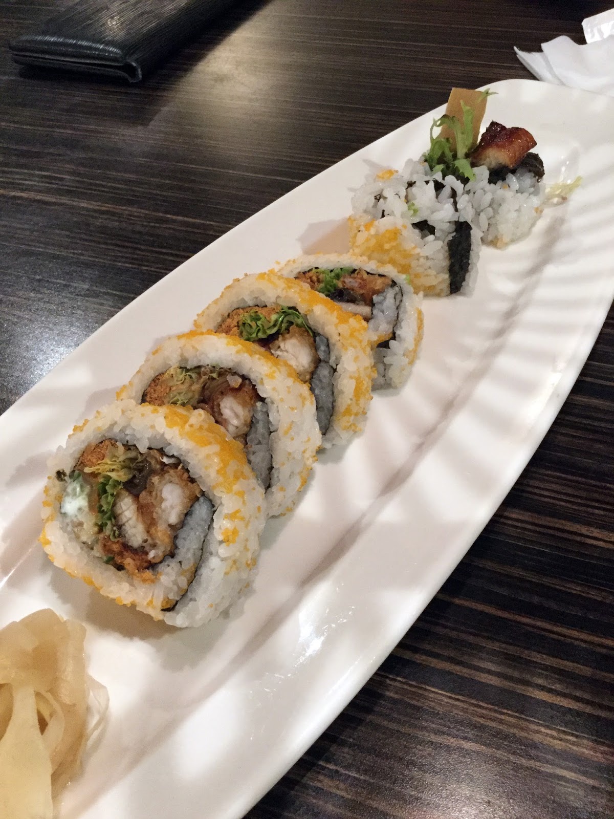 食堂創意花壽司以鰻魚為主角,生菜等酥脆的餡料填得飽滿,一整份吃起來蠻飽的。