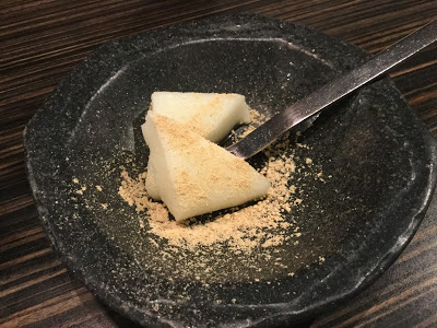 最後還會附上甜點--黑糖軟糕,沾著些許黑糖蜜與黃豆粉,吃起來口感不錯。