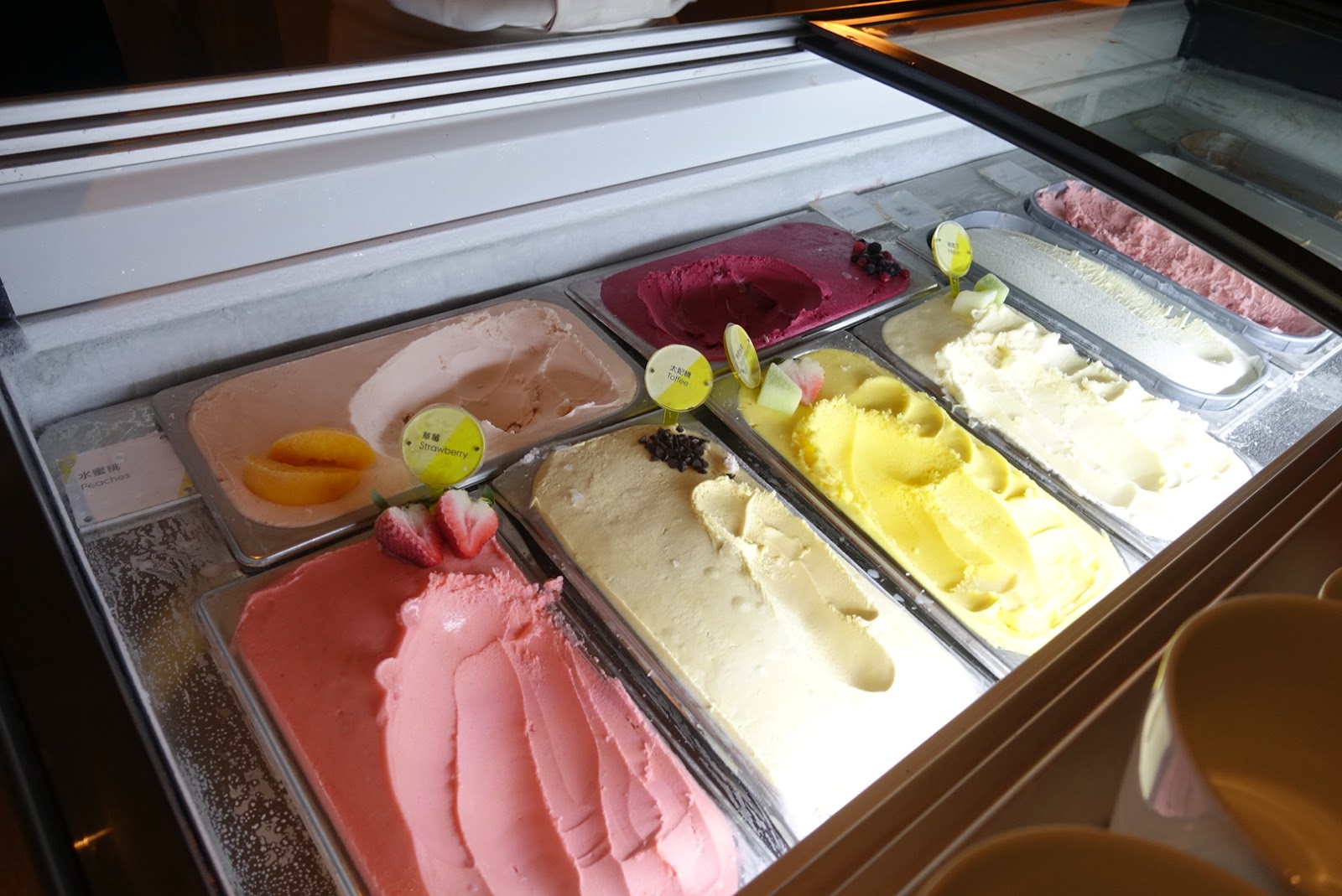 冰淇淋的水果雪酪味道清新,吃完蛋糕再來一份雪酪,不用自己費力去挖冰淇淋,有專門的人在幫忙挖,只要選擇口味,就能輕鬆吃到冰淇淋,服務得很周到,拿到冰淇淋後可以自己添加配料,我這份草莓與水蜜桃雪酪再加了草莓醬、櫻桃醬酸甜滋味更加明顯,冰涼爽口。