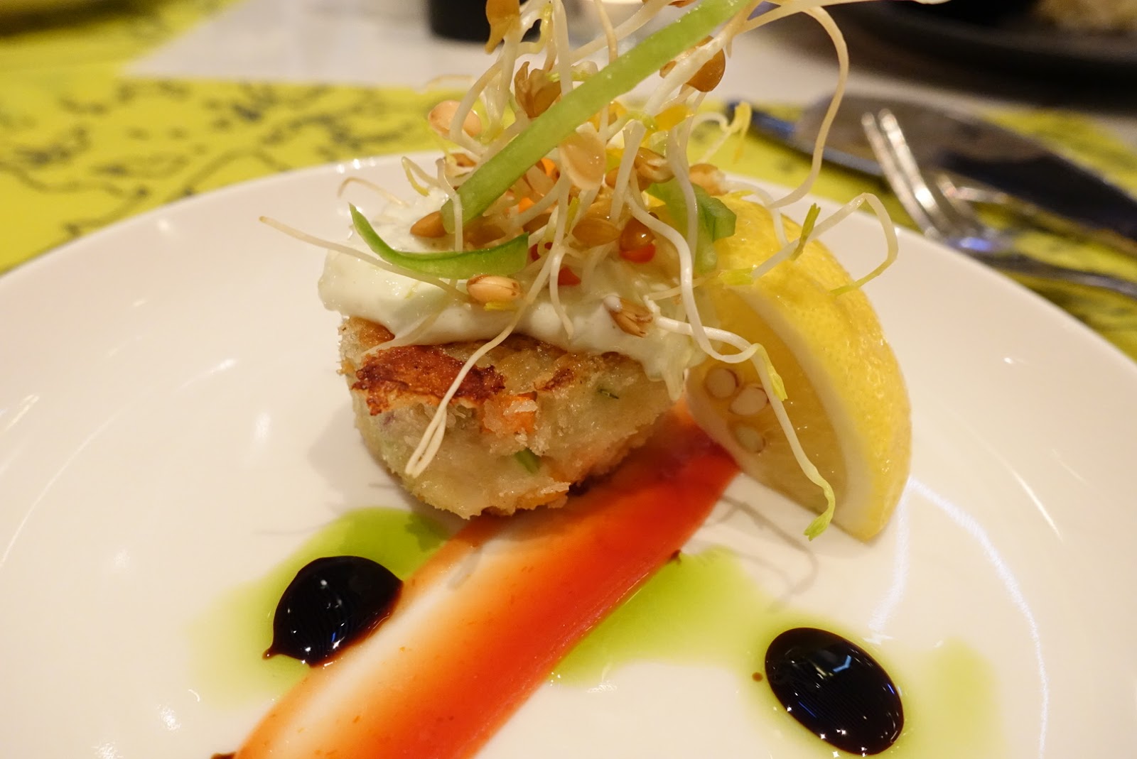 吃到一半,這款酥炸蟹肉餅熱呼呼的由侍者送到每個人的桌上,外酥內軟的蟹肉餅加上生菜絲增加口感層次,吃起來口感曼妙,我很喜歡這種Buffet中場的小驚喜。
