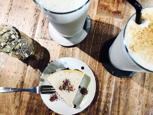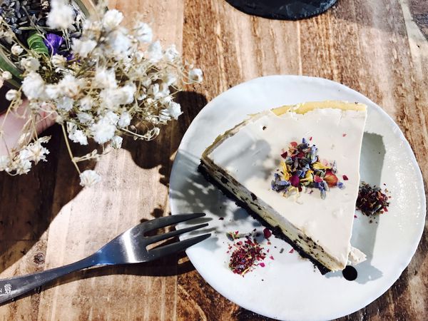 紫紫粉粉的花 撒在乳酪蛋糕上 ~ 整個擺盤 色調 讓人戀愛呢