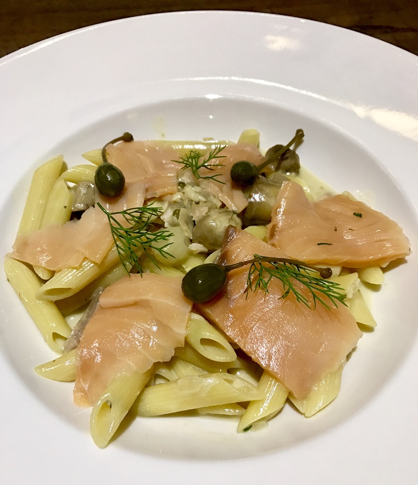 酸豆煙燻鮭魚筆管麵 是三訪新增加的料理