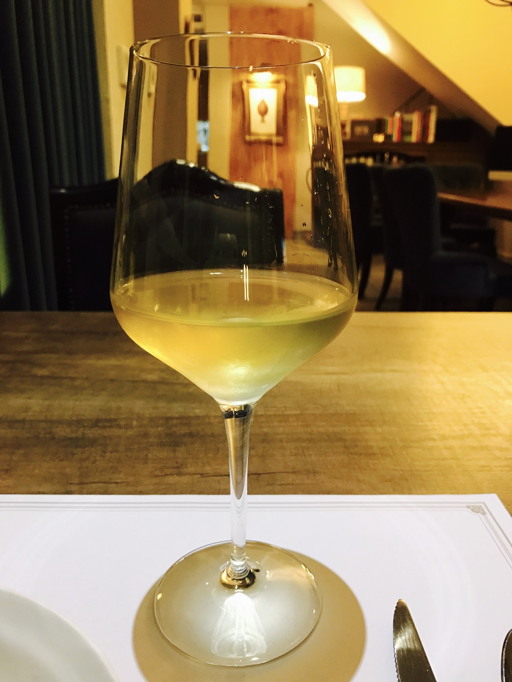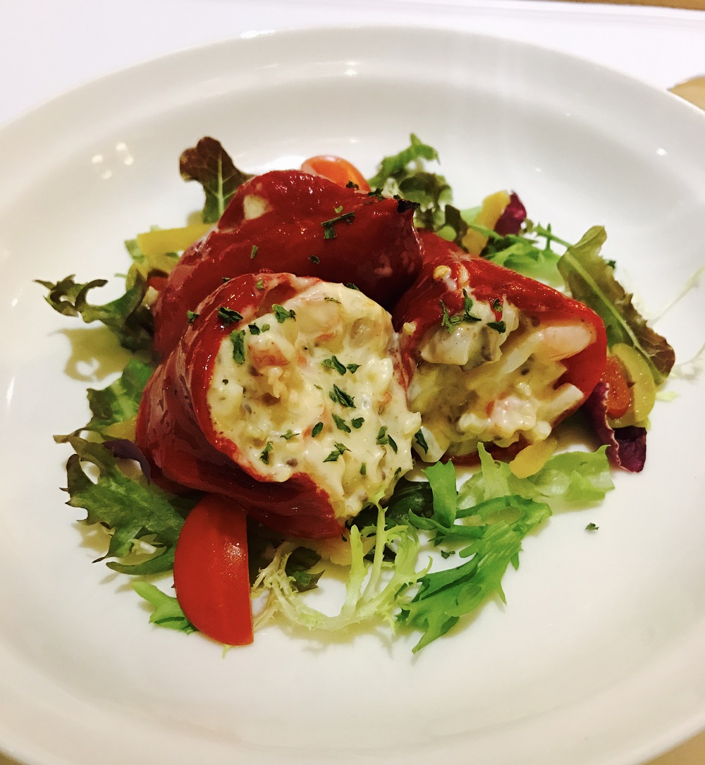 冷前菜: 煙燻舌形椒鑲海鮮 老闆說這道跟白酒很搭 還特別送我一杯白酒 要我試試看