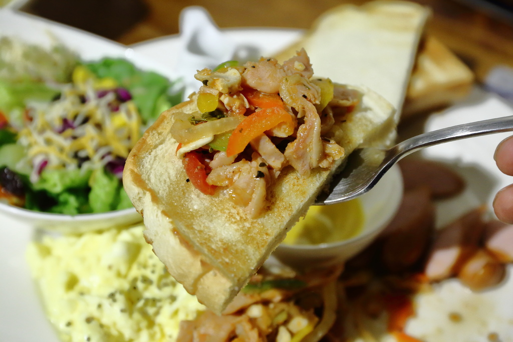 雙椒炒燻雞,顏色搭配非常吸引人,香氣十足,燻雞嫩嫩的還有點彈性, 搭配著吐司一起吃超對味