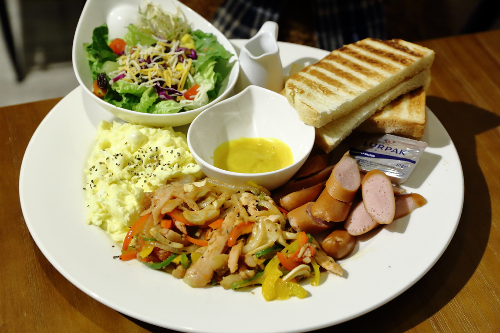 鮮奶吐司/奶油抹醬/嚴選燻雞/羅勒紅醬/法蘭克福香腸/美式炒蛋/季節沙拉/美式脆薯