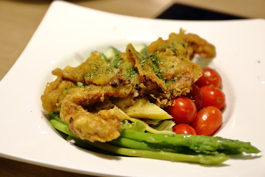 軟殼蟹裹粉油炸,外殼香酥、內層細嫩鮮美,不像一些餐廳都是在吃外皮那層粉;和爽口清新生菜沙拉搭配得很棒,超開胃令人食指大動