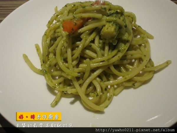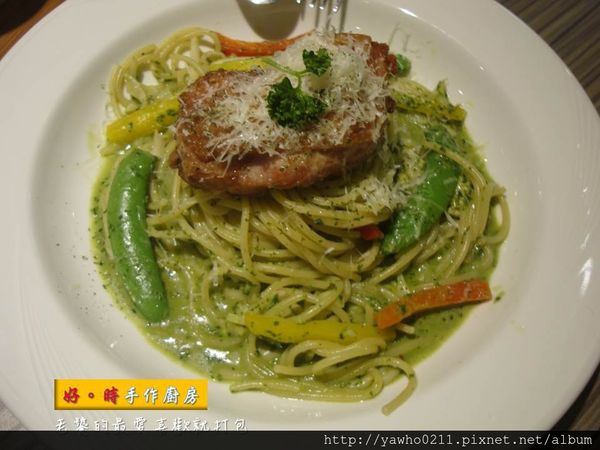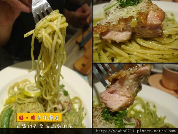 青醬的醬汁也滿佈在麵體上,雞腿去骨醃製過的肉很嫩也夠味。