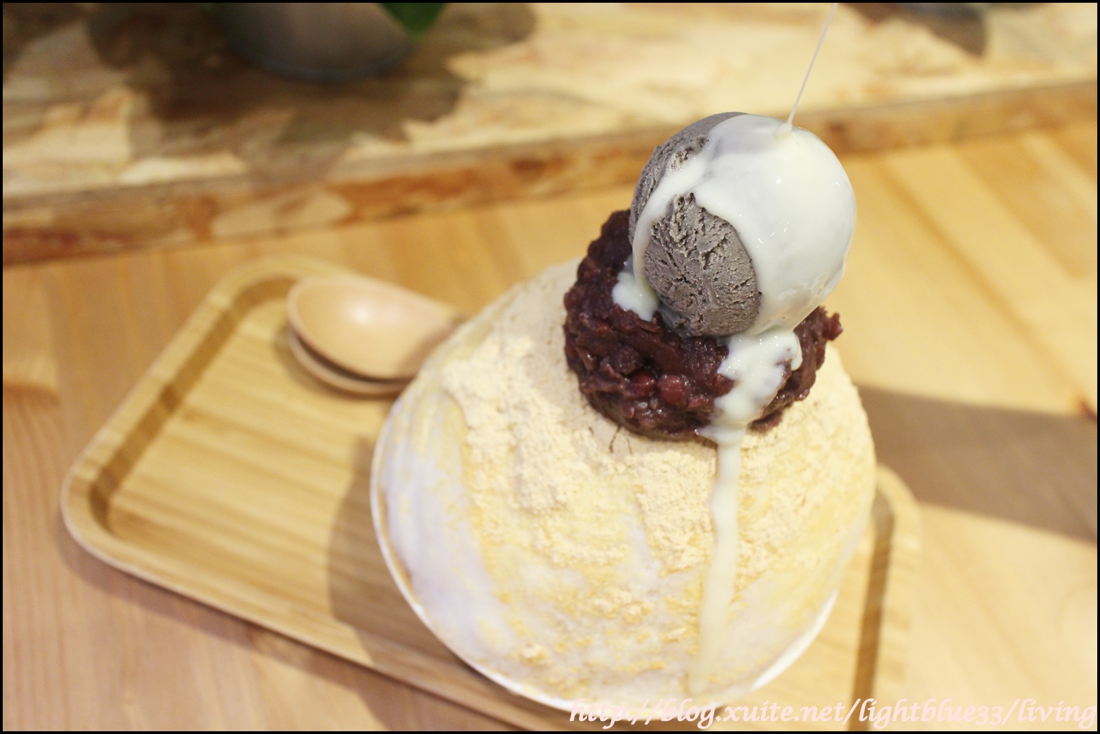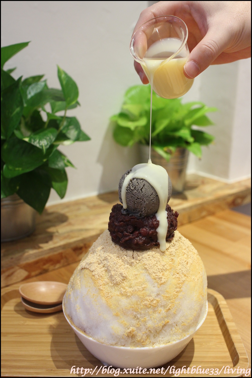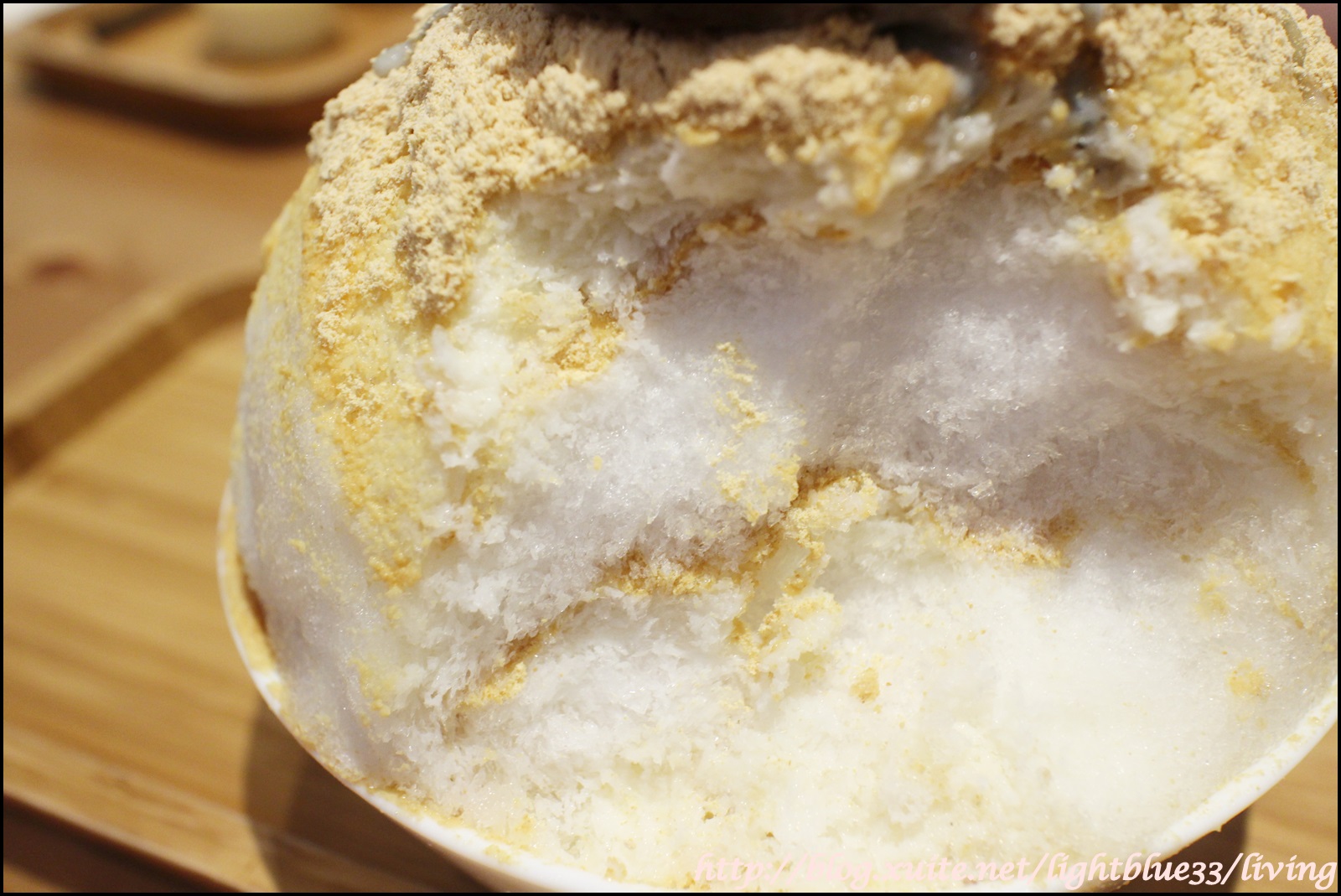 一匙一匙挖會發現黃豆粉跟煉乳會一層一層撒上,所以不會只有表面吃得到黃豆粉,然後底下都是沒味道的清冰這樣,而且因為黃豆粉只有微微的甜度,但是又有舒服的香味,搭上煉乳很契合。冰則是介於碎刨冰和雪花冰之間,在口中抿一下就會輕輕化開,是我喜歡的口感,這樣一份兩人分食剛剛好,雖然不是抹茶,但是吃完我也很喜歡、很開心