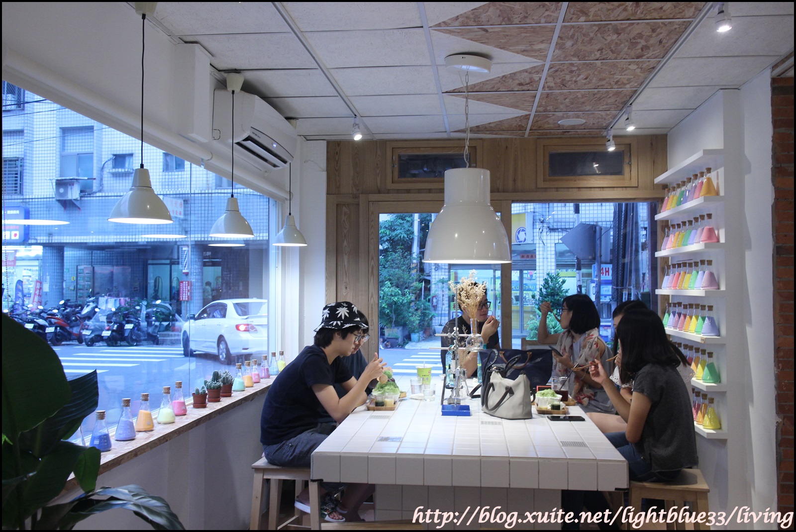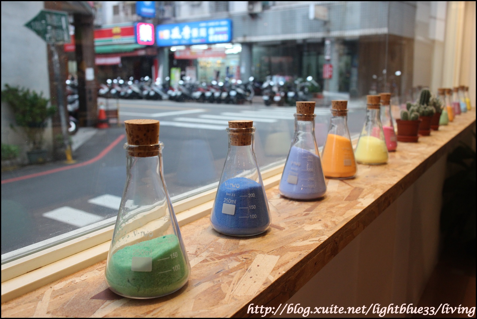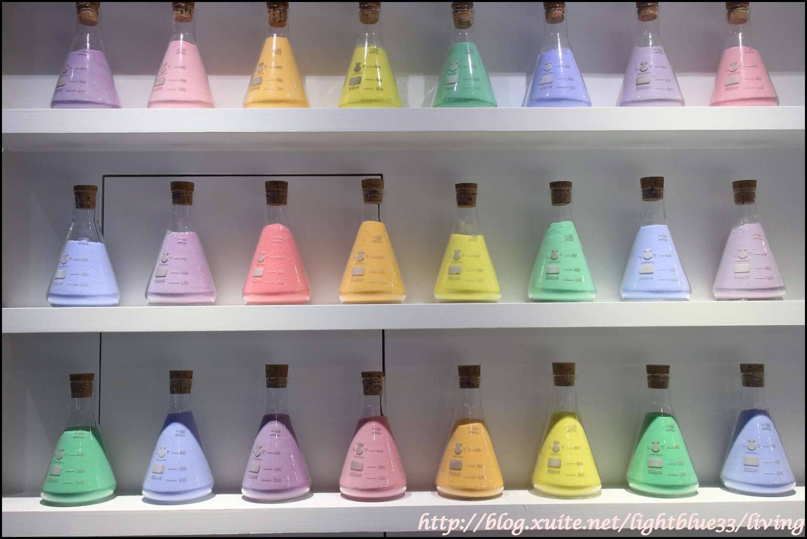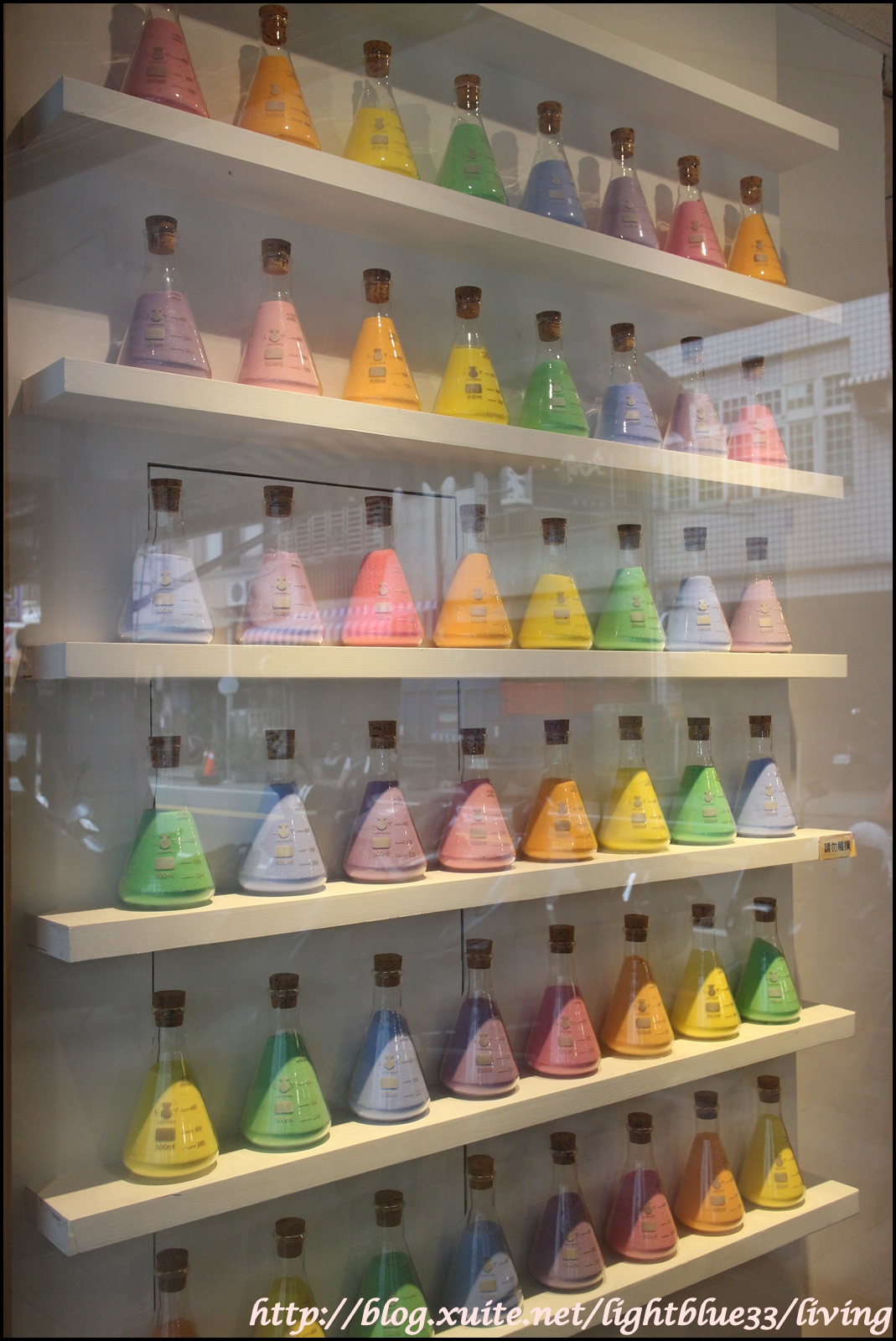 店門外就可以看見這一面拍照熱點的燒杯裝七彩沙,好粉嫩啊