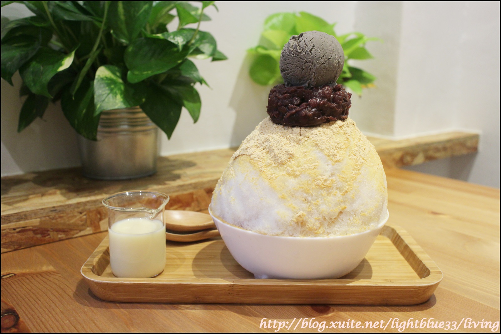 老實說,一開始看到黃粉牛乳金時是讓人有點小失望的,因為擺盤很樸素啊,結果開動之後才發現原來很好吃呢!芝麻冰淇淋很香,味道很濃郁,搭配沒有甜度的紅豆與黃豆粉和冰,也給人很日式風情的感受