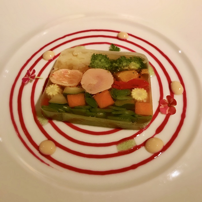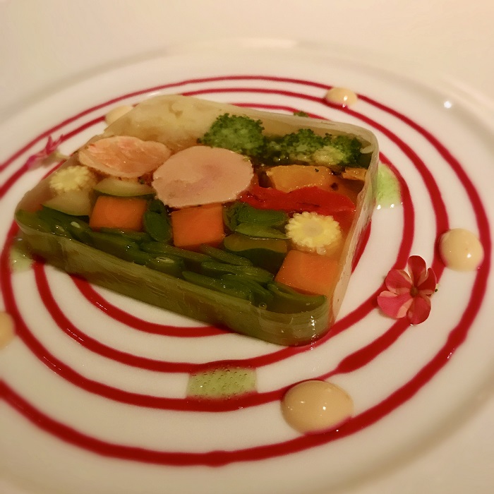 蔬菜凍裡 也放了鵝肝 周圍五顆黃色的是豆乳醬