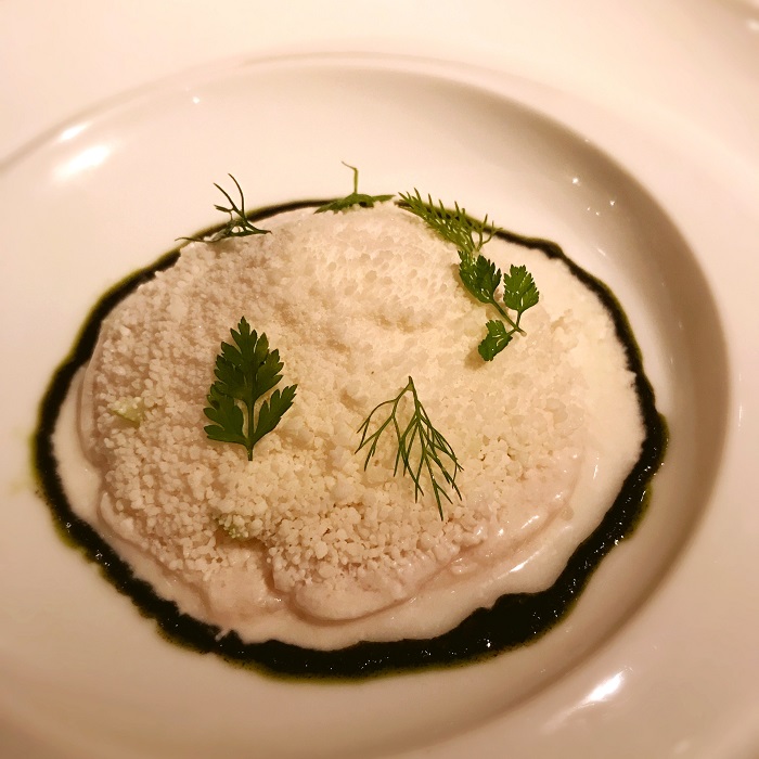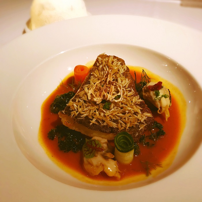 魚排口感很特別 上面撒的是魚鱗 (原來魚鱗也可以料理 開眼界了...) 上菜後服務生會淋上海鮮湯