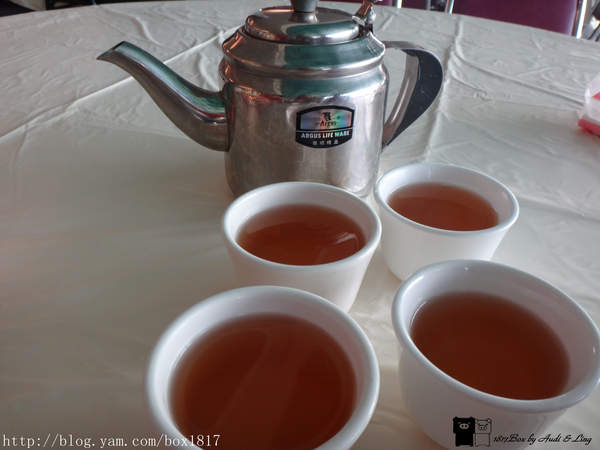 會館服務人員帶我們到餐廳入坐,送來茶水,