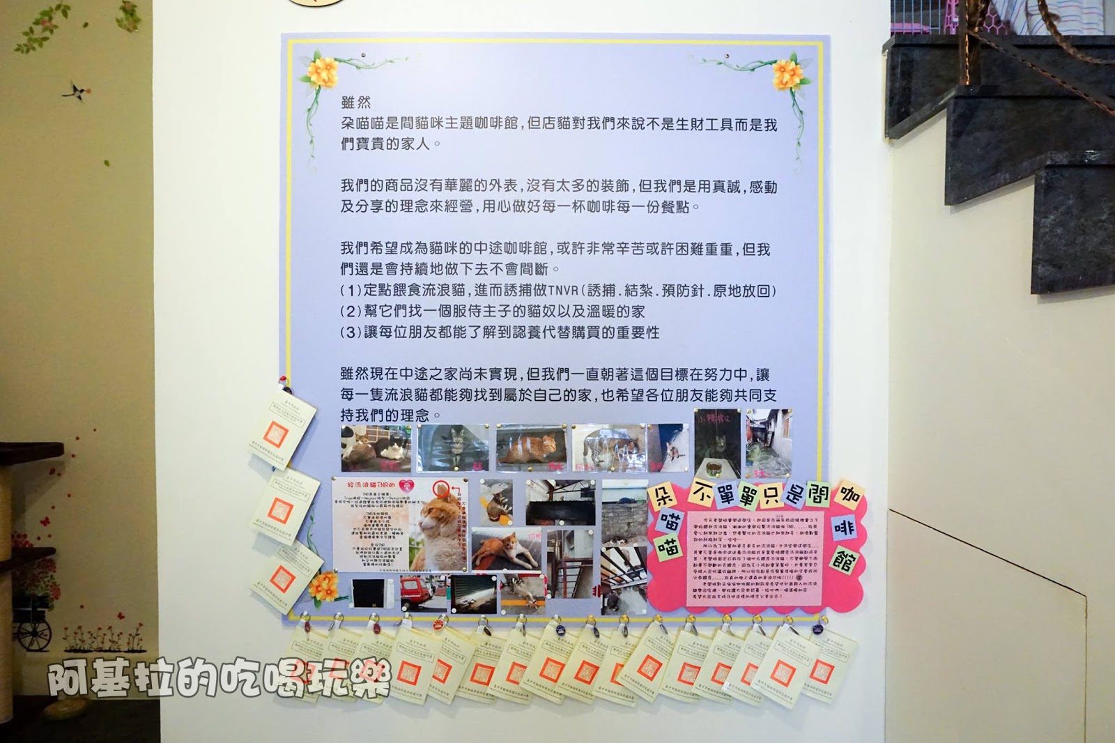 ▲牆上有貼一張公約,為了愛護店裡的貓咪們,希望各位可以配合,避免對貓咪們造成傷害,尤其是有帶小朋友來用餐的家長,特別要注意餐廳禮儀,禁止嬉鬧行為,可以藉機會教導小朋友如何善待小動物,因為貓咪是很敏感的生物,容易受到驚嚇,長時間處於緊張的環境就會生病。