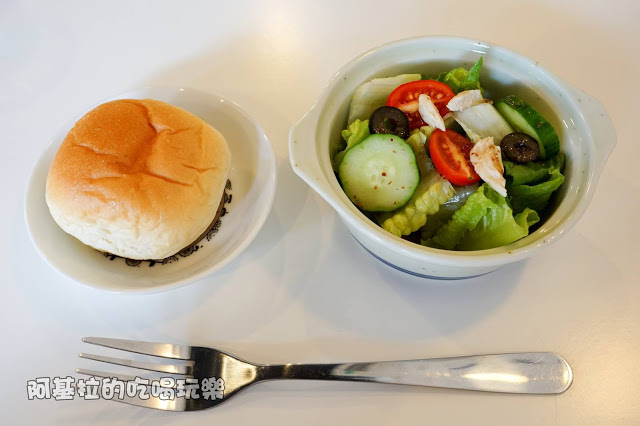 柔軟的餐包裡面有奶油,這不用我說,相信大家都能知道有多好吃。沙拉是採用蘿美生菜、黑橄欖、小蕃茄、小黃瓜,搭配油醋醬,口感清脆又清爽。