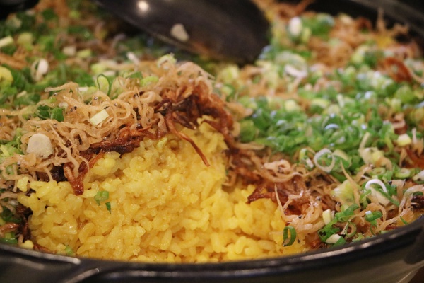 薑黃飯上面像是吻仔魚的是脆魚,加上紅蔥酥與蔥末,拌一拌更加入味好吃,大口吃還吃到脆魚脆脆的口感,有不同層次的滋味唷!!
