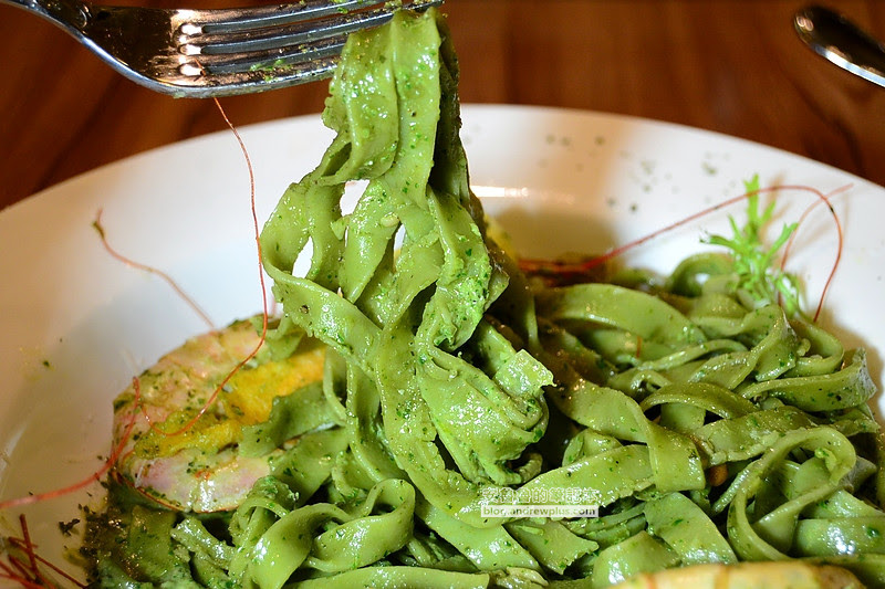▼麵條調味濃郁,滿滿都是青醬清爽的滋味,使用純正的橄欖油吃起來不油膩,光吃麵就很讚又Q彈,整個青醬均勻的附著在麵條上面,在嘴裡咀嚼香氣縈繞在口腔鼻腔裡面,非常入味