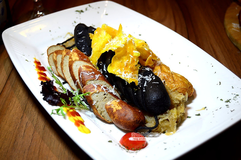 由瑞士腸、起司腸、墨魚腸三種香腸組合而成的拼盤份量很驚人,上頭擺放地瓜片,加上現刨起司,香腸的調味偏重,口感是,而德國進口酸白菜則是帶有甜味,兩者搭配食用就成了三五好友聚會小酌時的好選擇。