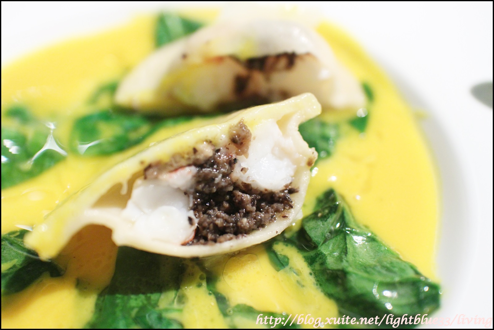 前菜的另一款是松露螯蝦餃佐煙燻南瓜濃湯,綠色的是菠菜,頂端還有陳年起司一片