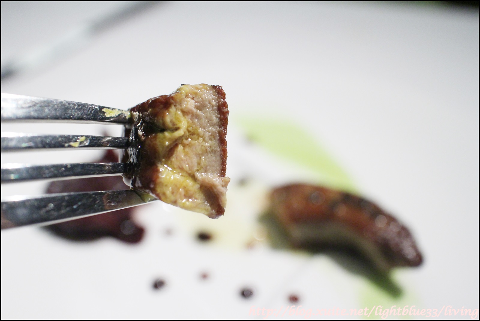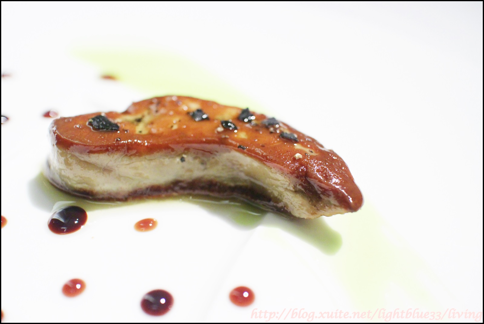 鵝肝外頭煎得焦香,裡層則滑順而不油不膩,而且不會粉粉的,只簡單搭配一點海鹽就很讚
