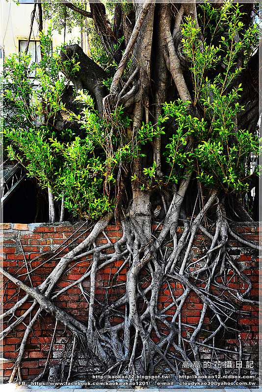多數空屋早已被攀藤植物與榕樹氣根吞噬屋角與紅磚牆面,