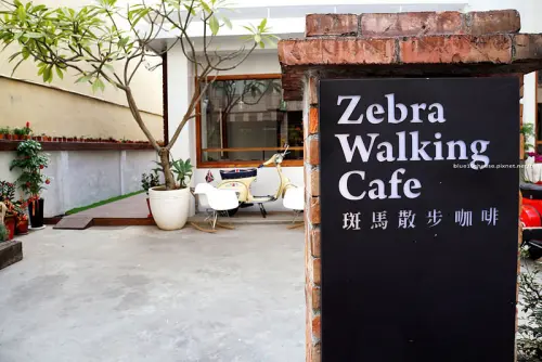 斑馬散步咖啡Zebra Walking Cafe,隱藏在巷弄中,白色兩層樓,前面還有一大片庭院,還會誤以為這是誰家的豪宅?其實他是一棟老宅改建的咖啡廳,蠻喜歡這種清新乾淨的感覺,庭院還有紅色和白色的偉士牌機車有種奇妙的對比感。對了!餐廳外頭是一排的機車停車格,算是很好停車又不怕拖吊。