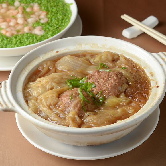 招牌功夫菜「揚州獅子頭」,是選肉、刀工、火候各有獨得之秘,精選豬腿肉,肥瘦肉黃金五五比例,細切粗砧,細火慢燉兩個小時以上,腴嫩鮮美,口感極致入味。配上鮮甜多汁的白菜,滑順酥軟,入口即化。