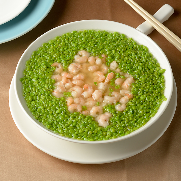另一道特色菜─「豆米河蝦仁」,選用清甜的甜豆仁,河蝦仁雖體型略小,但是肉質緊實細緻,大骨熬煮的雞湯澆頭,口感清爽解膩。