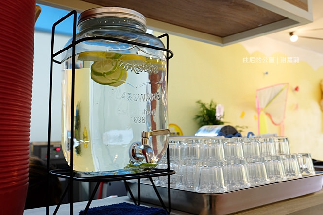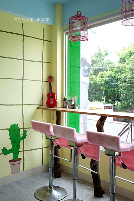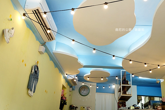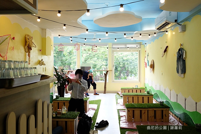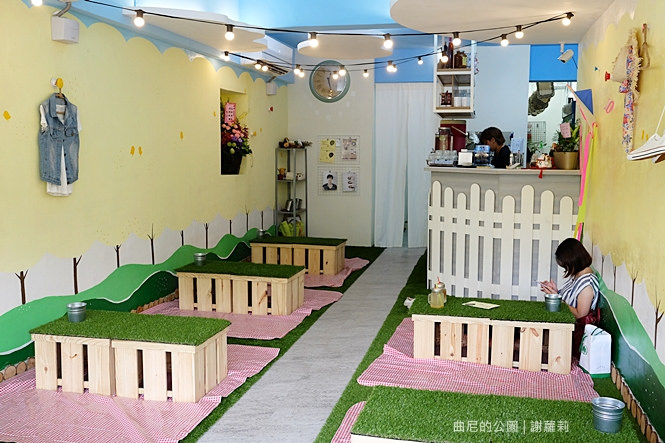 信步拾階走上二樓,這裡面藏了一個宛如野餐公園的小天地,藍、黃、綠、紅,相互交織著綻放一股活潑氛圍,整個空間不算大,放眼望去盡是野餐場景,像是草綠地毯、格子野餐布,牆面也懸掛著一些很盛夏風的物品點綴,看起來稱不上精緻,但卻是青澀地流露出可愛氣息。
