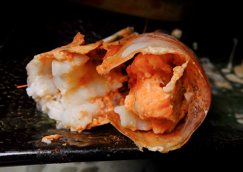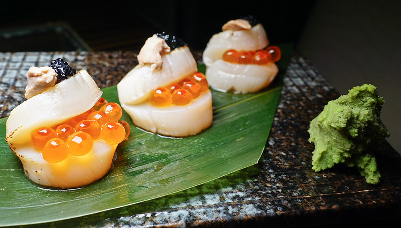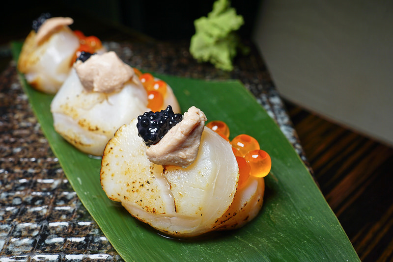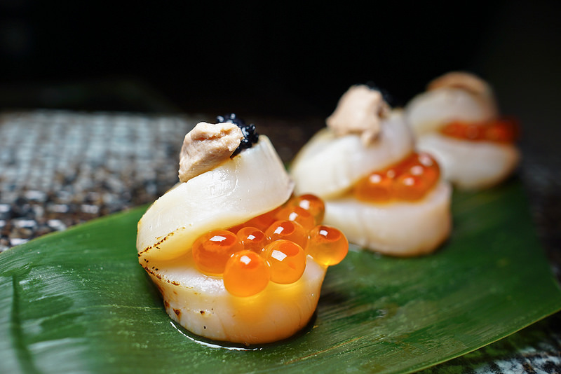 干貝稍稍炙燒過, 與其他地方通常是擺蟹膏或海膽不同, 它擺的是鮭魚卵