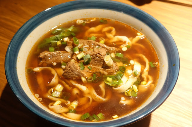 第一次來一定要先品嚐大叔眷村牛肉麵,也就是所謂的紅燒牛肉麵,湯頭嚐起來微辣、不會太鹹,也沒有太鮮甜的人工調味,帶著豆瓣醬熬煮出來的滋味,湯頭味道很自然,吃完也不覺得口乾舌燥,稍寬的手工麵條吃起來有些軟,沒有Q彈的口感,令人有點失落,牛肉帶著點嚼勁,不是燉得很軟爛那種,吃得到牛肉本身的鮮度。