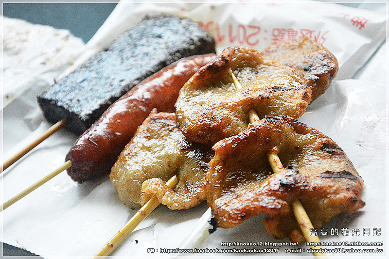有烤黑輪片兩支(一支15元)、烤香腸(20元)、烤米血(15元)。