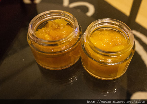 老闆親力親為的季節性手工水果果醬,今天是鳳梨、芒果兩種口味,
