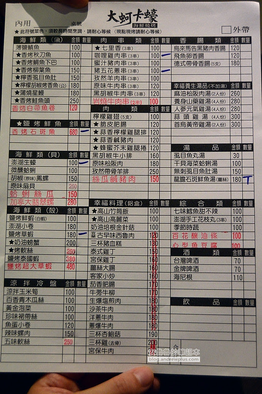 安魯魯的筆記鄰近新莊夜市附近的豐年街,有家價格親民、物超所值的海鮮燒烤餐廳 - 大蚵卡蠔海鮮燒烤,我想如果沒有巷子內的饕客朋友帶路,外地人除非運氣好,不然不容易發現這一家高CP值的餐廳,親切的老闆不愛炫麗的店內裝潢,只希望來到他店裡的客人不但吃得滿意而且吃的健康,從食材的嚴選到烹調的方法都有其堅持的原則,也因此常有熟客回來用餐! 小安子和老佛爺今天吃到了前所未嘗過的超鮮甜的草蝦、龍膽石斑魚湯和香烤石斑魚,補充了滿滿的元氣、海味就是要新鮮!!