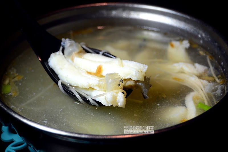 ▼龍膽石斑就是要吃那一層魚皮下的膠質,千萬不要放過這一層透明吃起來像果凍卻超級Q彈的膠質層! 湯匙在鍋裡面翻攪的時候很容易把這一層膠質從魚肉上面給剝離下來,喝湯的時候記得要多撈撈鍋底,把所有的膠質都找出來吃光光唷!