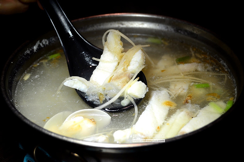 ▼所以我們今天就點了這鍋 龍膽石斑鮮魚湯!第一次看到魚肉是切成條狀的湯品,還有個頭飽滿的蛤蜊大加分,大量的薑絲調味去寒不搶味