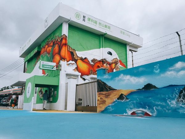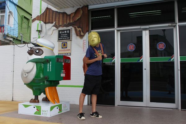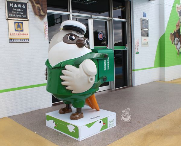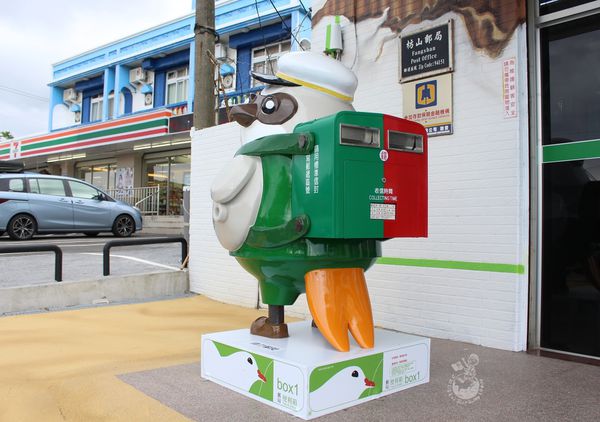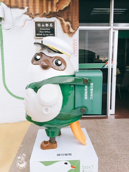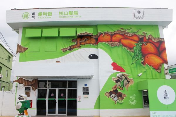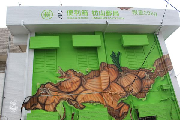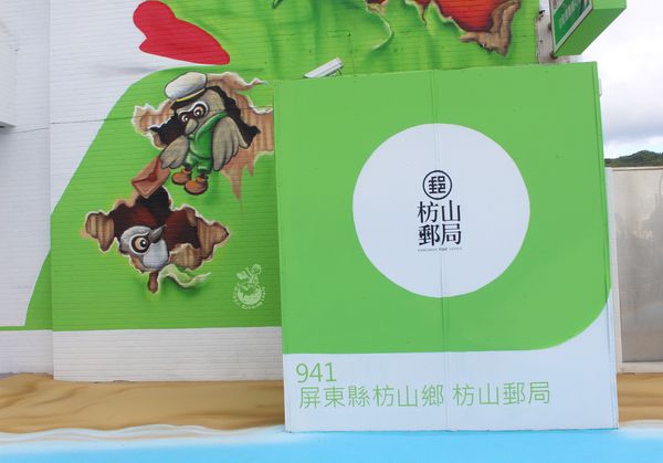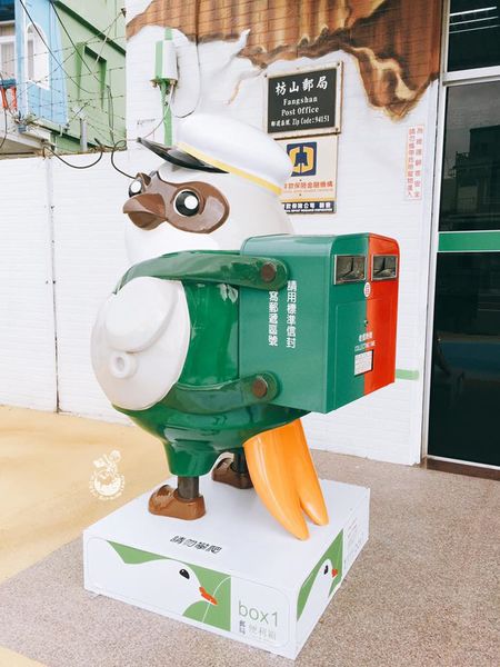 一早從台中殺到屏東,就為了枋山郵局!!!枋山郵局屏東41支局從10月14日煥然一新,外觀變身成一個超級巨大的郵局便利箱,箱內裝的是當地特產的洋蔥和愛文芒果,藉此推廣當地的農產品。因枋山鄉以伯勞鳥文化著名,門口還特別設置了伯勞鳥造型郵筒,還結合環保概念,屋頂上的太陽能系統,每到整點時還會自動開啟,畫面宛如便利箱打開了一樣,遺憾的是因前陣子颱風有點損壞了,故最近無緣欣賞到枋山郵局的「開箱秀」。