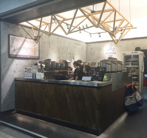 (雖然是飲料店,但我覺得店內的裝潢應該是有下一番工夫的~清水牆風格,上方的幾何木頭支架上還有小鳥哈哈,我一直覺得有小鳥很奇妙~當然不是真的小鳥啦)