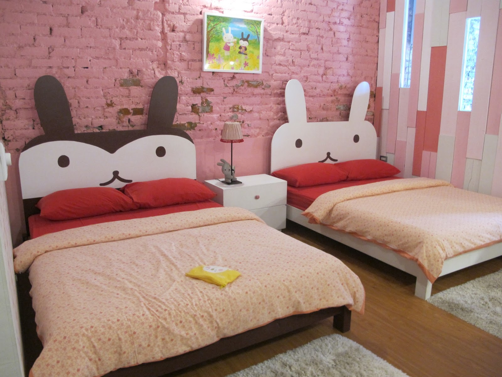 兩張大床的床頭櫃皆是超卡哇已的白兔妹
