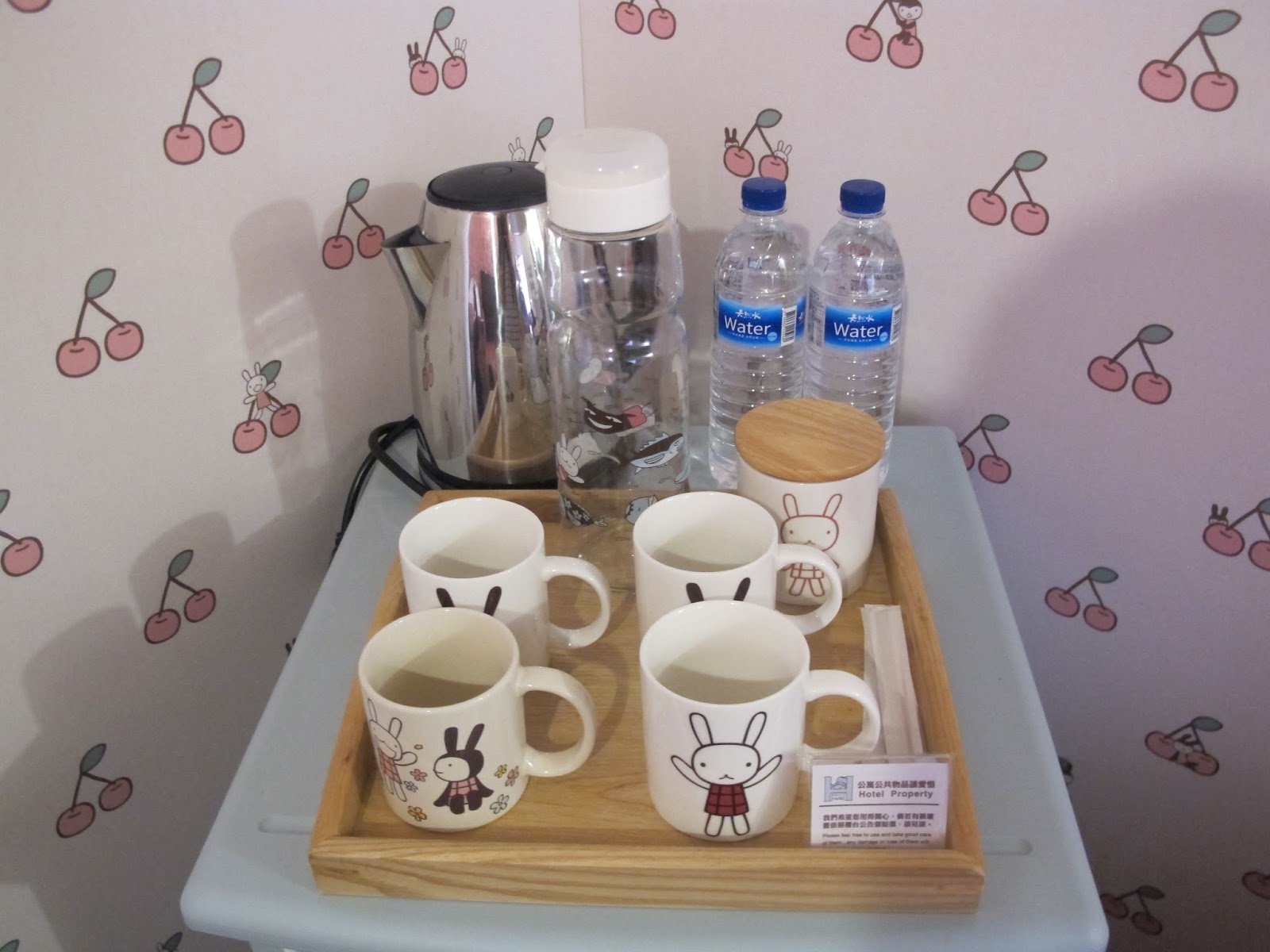 冰箱上放著許多白兔家族馬克杯、磺泉水及熱水壺