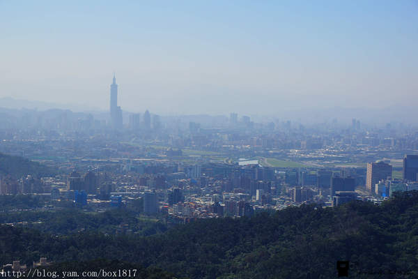 也可眺望台北盆地,臺北101大樓、圓山大飯店及臺北松山機場觸目可及,車陣川流不息;