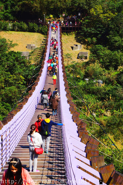 淡紫色的白石湖吊橋在山谷裡非常顯眼,