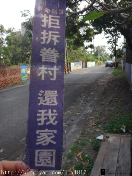 走進共和新村裡,仍可見到當地居民掛的布條,