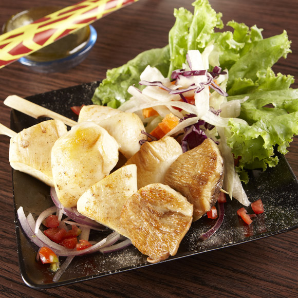 「招牌牛肉串」嚴選美國優質牛肋,均衡分布的油花,肉質細嫩甜美,十多種特殊醬料醃製,注入新鮮檸檬與香橙肉質,更加滑嫩順口,燒烤七八分熟,沾取些許鹽巴,吃一口便齒頰留香,香味四溢。