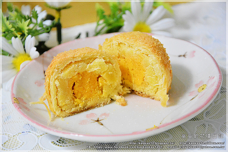 官網是這麼寫的:多層雪花酥皮搭配細柔白鳳豆、綠豆仁及紅土鴨蛋鹹蛋黃內餡,