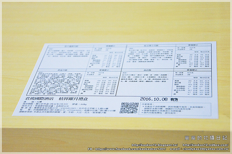 禮盒後方有每一種月餅詳細的產品成份介紹、熱量表、有效期限等,